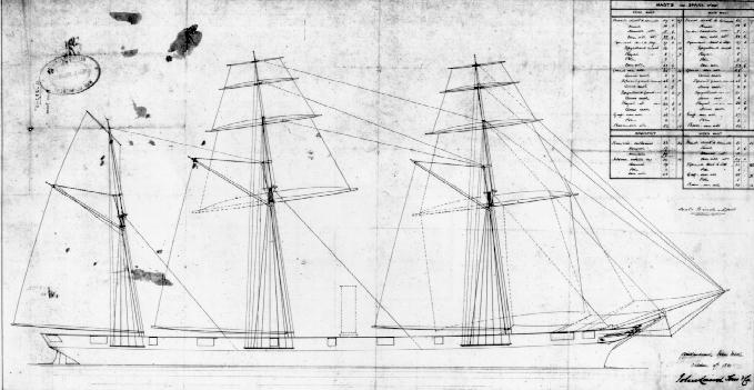 Her guns are of the Blakely pattern, and manufactured by WESLEY & PRESTON, Liverpool, 1862. She is bark rigged, has very long bright lower masts and black mast heads, yards black, long yardarms, short poles, (say one to two feet) with small dog vanes on each, and append ant to the main studding-sail booms on the fore and main, and has wire rigging, carries on her foremast a square foresail, large trysail with two reefs, topgallant sail and royal. On the mainmast, a large trysail with two reefs and a bonnet. No square main-sail bent, topsail two reefs, topgallant sail and royal. On the mizzen mast, a very large spanker and a short three cornered gaft topsail, has a fore and foretopmast staysail and jib. Has had no staysails to the main or mizzen masts bent, or royal yards aloft.